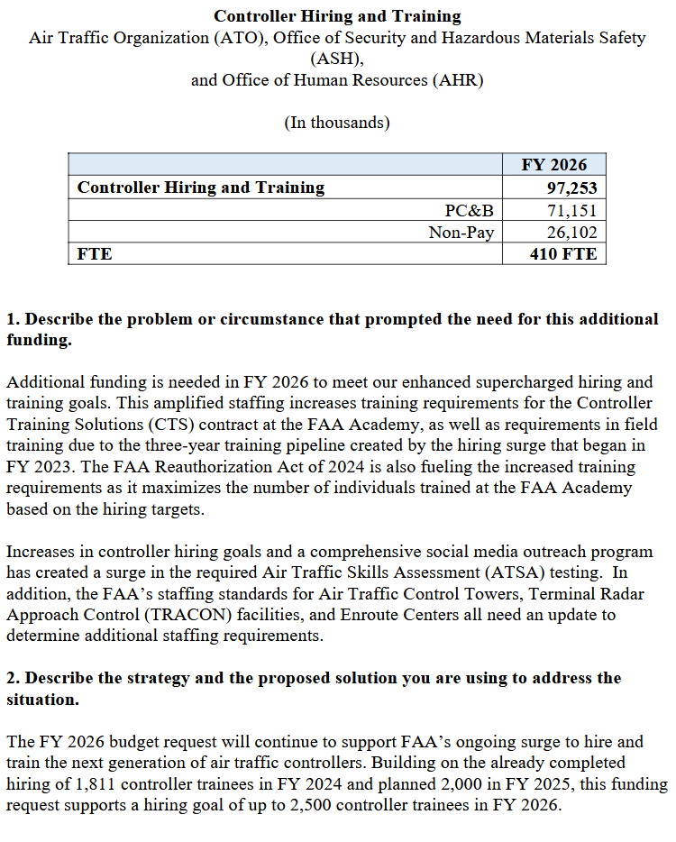 This budget request includes $142.0 million of targeted programmatic increases that will allow FAA to support key initiatives on controller hiring, aviation safety and oversight, and cybersecurity. This includes $97.3 million to meet the hiring and training goal of up to 2,500 air traffic controller trainees in FY 2026, allowing FAA to rebuild the pipeline of the Certified Professional Controller (CPC) staffing levels to meet current traffic demands and improve safety. The hiring and training supercharge will streamline the path for controller training while further increasing resiliency to serve high demand markets.