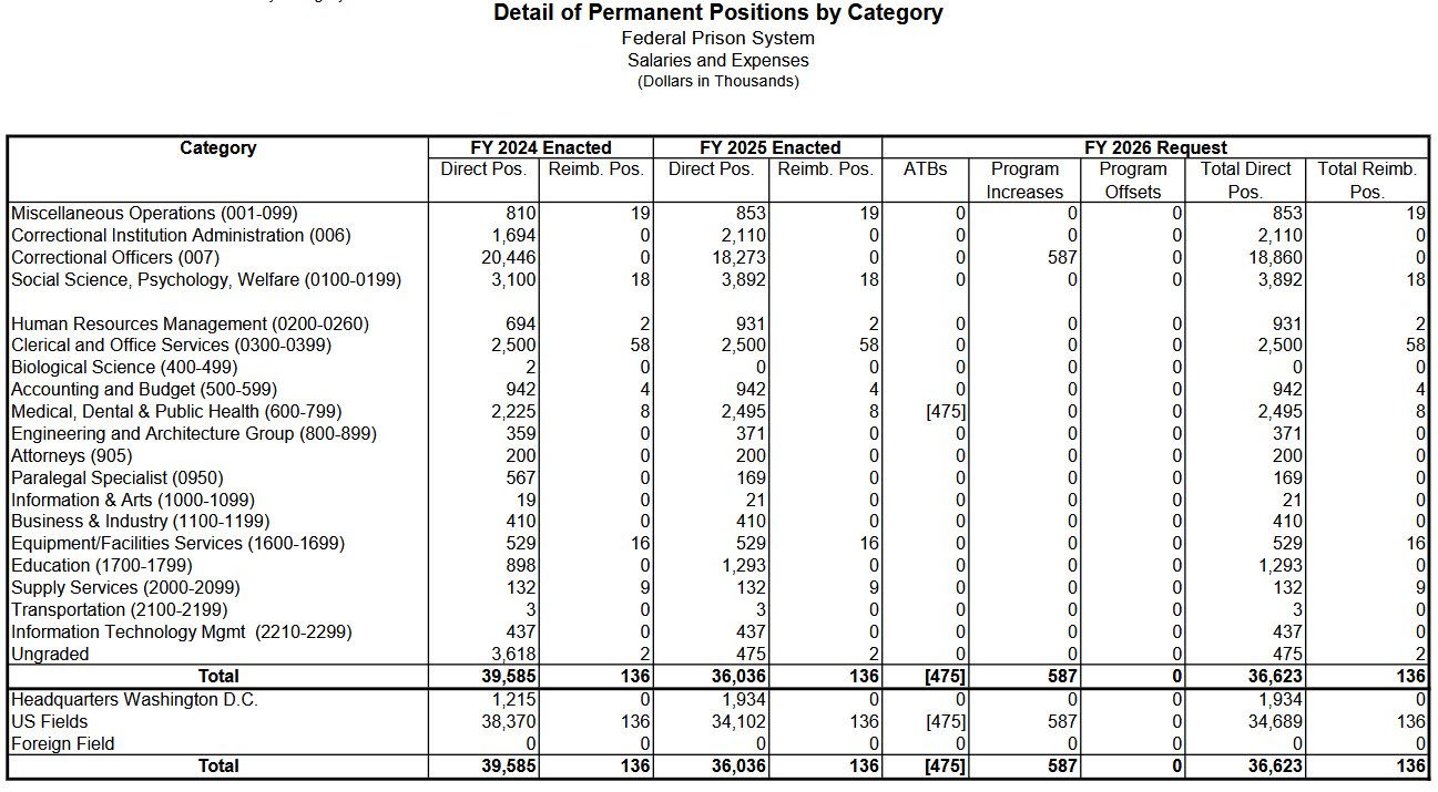 You can see that the vast majority of BOP employees are correctional officers (18,860), they also employ a fair number of social science, psychology and welfare employees (3,892) and medical, dental and public health workers (2,495). And you can also see that all staffing increases in this budget request are for correctional officers (587).