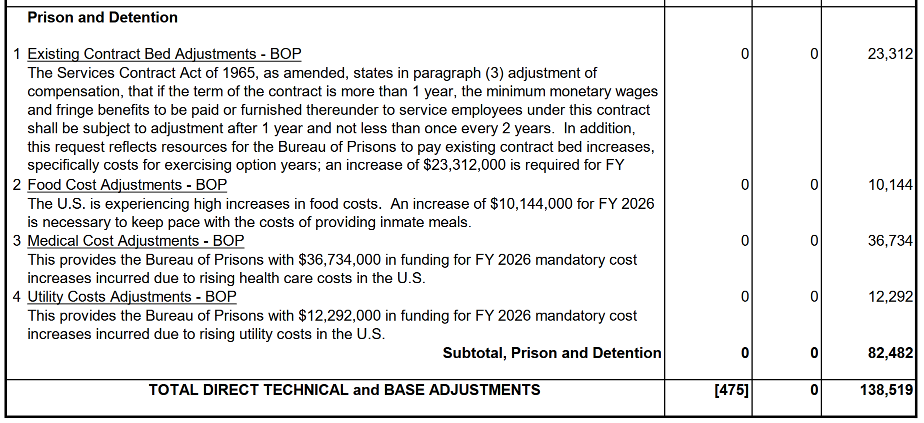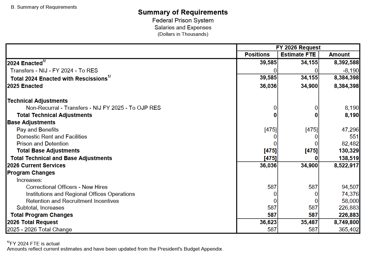 Now we're getting somewhere. First off, the appendix is in millions; here we're working in thousands. Note the Base Adjustments and 2026 Current Services line. This is BOP saying, here's what it costs to run this program next year changing nothing from last year. For Salaries and Expenses accounts, this is really just the new cost of the same number of full-time equivalents (FTEs) from the prior fiscal year. But you get detail. It costs $138 million more to run the same program in 2026 compared to 2025. $47 million of that is pay and benefits; $82 million is for prison and detention.