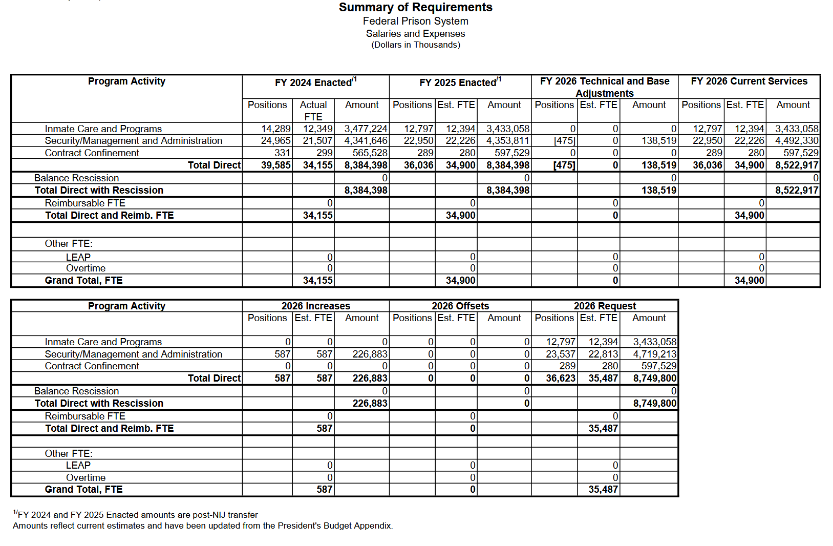 - What we're requesting and why: "The FY 2027 request includes $[X] million for Inmate Care and Programs, an increase of $[Y] million over the FY 2026 enacted level, to address [specific need]."